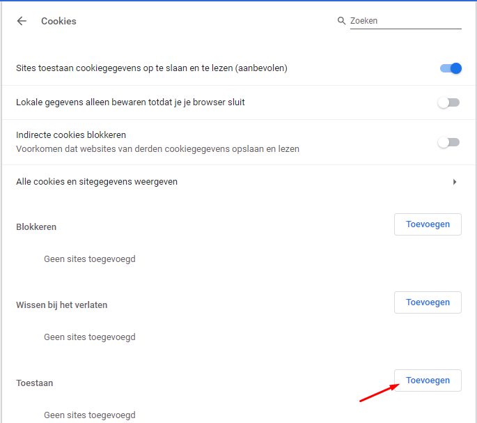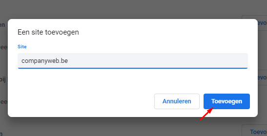 Onderaan op deze pagina klik je op bij de sectie toestaan optoevoegen. Een nieuw dialoogvenster opent zich waar u enkel nog companyweb.be dient in te vullen en op toevoegen te klikken.