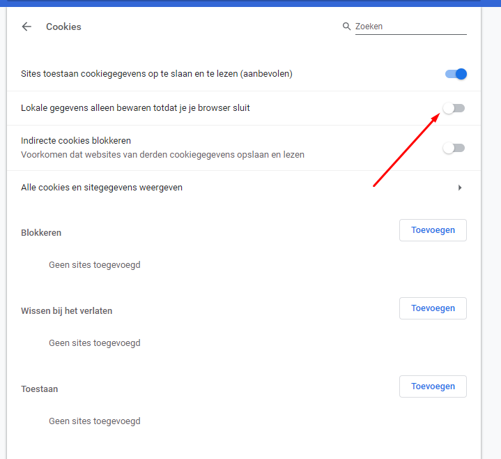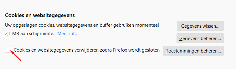 Op deze pagina is het belangrijk dat het tweede schuivertje niet aan staat, want als dit aan staat, worden uw cookies na elke sessie verwijderd.