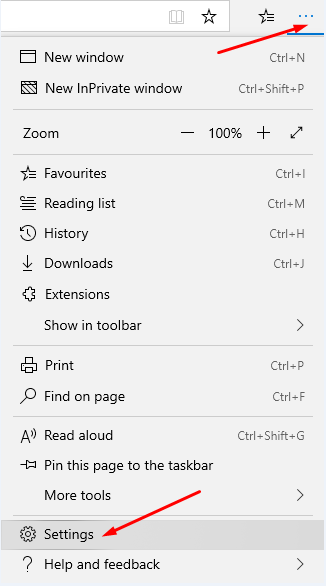 Klik op de drie puntjes in de rechterrbovenhoek van Microsoft Edge. In het openklapmenu klikt u daarna op Settings.