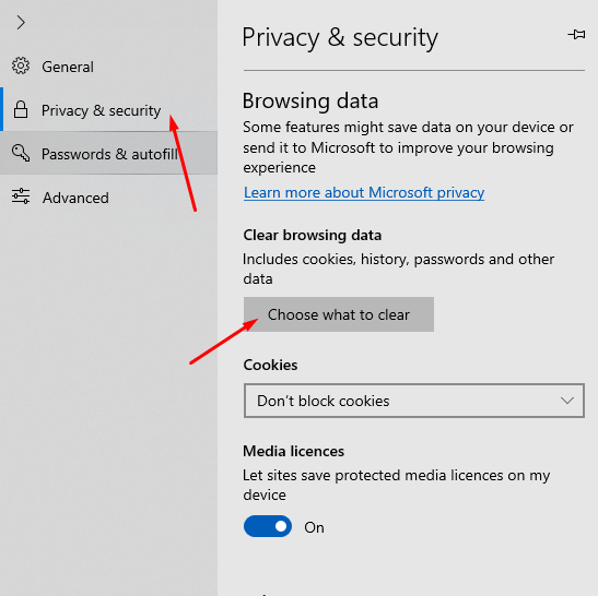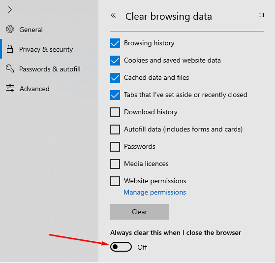 Klik op het tweede tabblad 'Privacy & Security'. Daarna klikt u door op 'Choose what to clear' en zorg ervoor dat het eerste schuivertje niet aan staat.