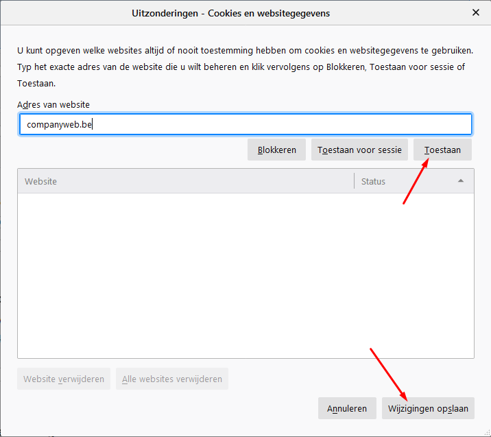 Er opent zich een venster en in het bovenste invoervak typt u companyweb.be en klikt u op Allow. Nadien hoeft u enkel nog de aanpassingen op te slaan via Save Changes onderaan. Ten slotte kan u deze pagina gewoon weer sluiten.