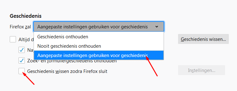 Daaronder bevindt zich een rubriek 'Geschiedenis'. Hier kan je ofwel in de openklapmenu kiezen voor de eerste optie, zo wordt de geschiedenis (waaronder ook de cookies) altijd bewaard. Als je kiest voor de laatste optie, namelijk de aangepaste instellingen, dat zorgt u er best voor dat het onderste hokje niet is aangevinkt.